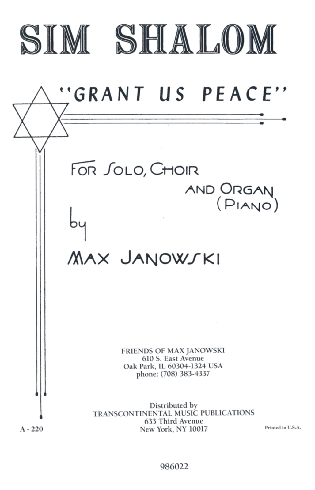 Perhaps Janowski's second-most famous piece, a stunning setting of this Shabbat prayer for peace, Sim Shalom. Available in Hebrew and English versions. Performed by countless choirs across the world - with showstopping beauty and power.