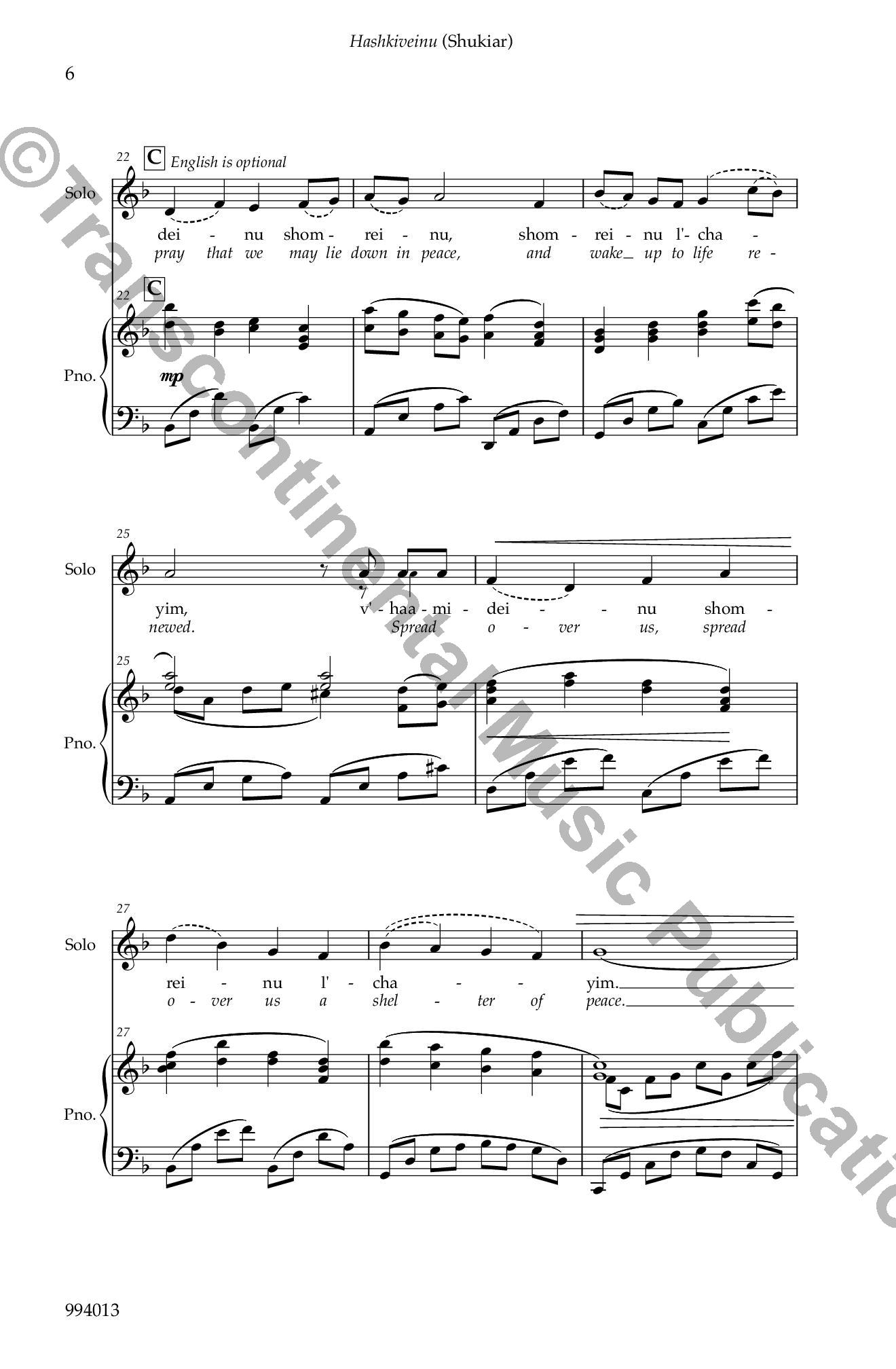 David Shukiar's Hashkiveinu is a beautiful setting of the evening liturgy, featuring an elegant, peaceful melody and approachable choral parts, excellent for mixed choirs of any level. Useful for performance or worship, Hashkiveinu includes two solo sections with optional singable English that can be sung by a soloist or choir members.