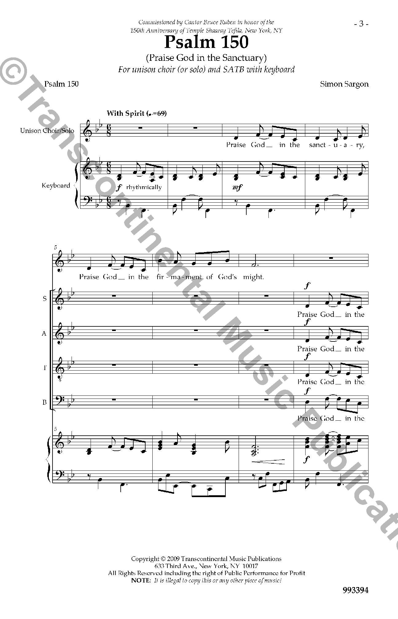 Transcontinental's 2009 Composer of the Year is featured with several great pieces in this release. This particular English rendition of Psalm 150 Praise God In His Sanctuary was commissioned in honor of the 150th anniversary of New York City's Temple Shaaray Tefila.