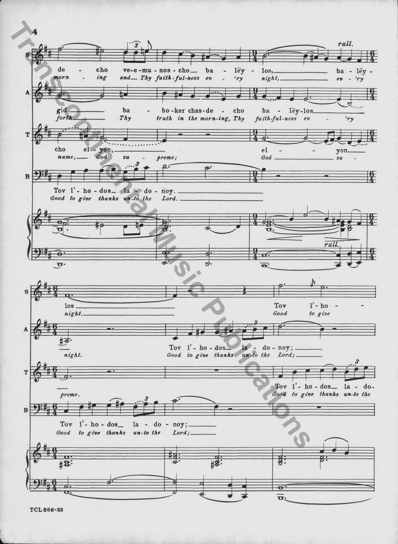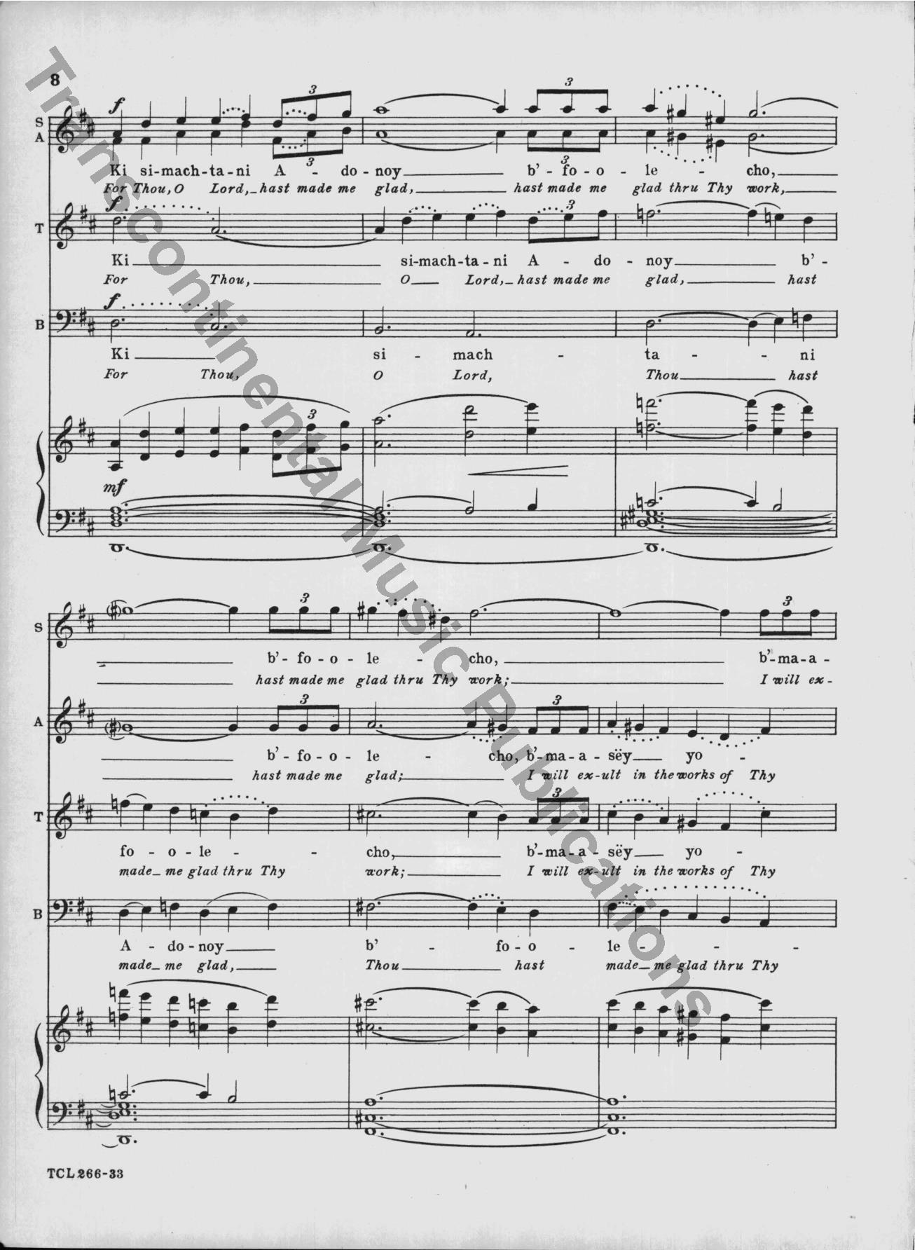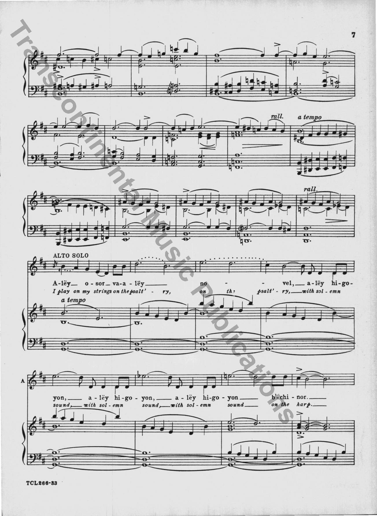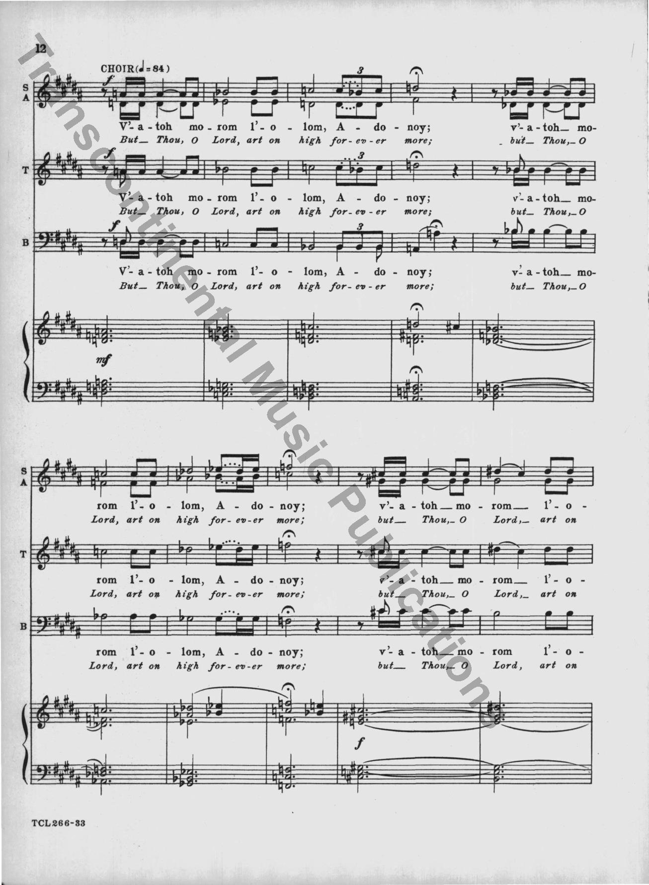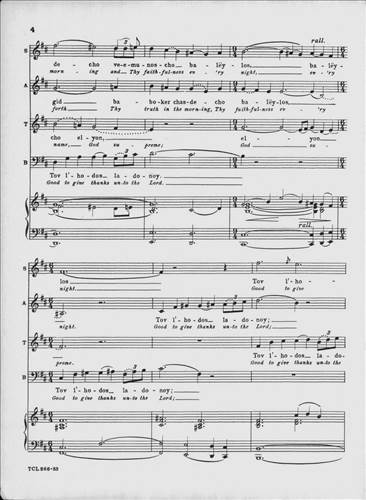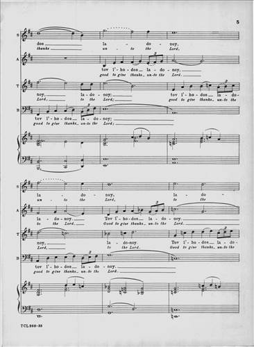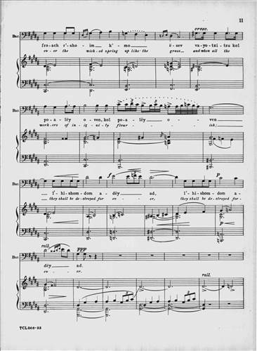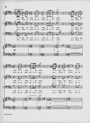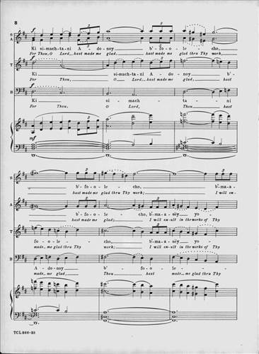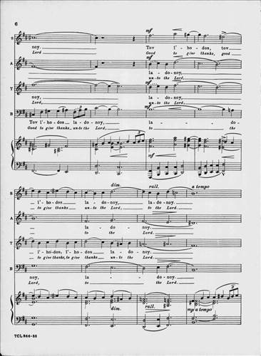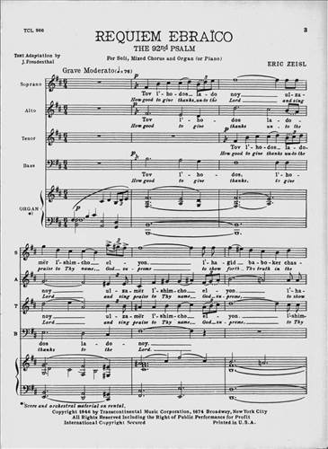 This classic 1949 choral masterpiece by Eric Zeisl sets Psalm 92 in singable English or Hebrew. Its grand-scale sound made a significant impact in the mid-century synagogue music world, and as was rare for its time, acknowledged the horrors of the Holocaust directly. From the original front matter: "True to ancient Judaic tradition, so significatly reflected in the Mourners' Kaddish—which in the hours of deepest sorrow "glorifies and sanctifies the Lo