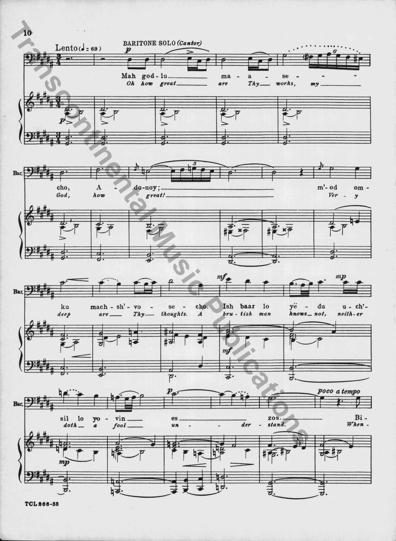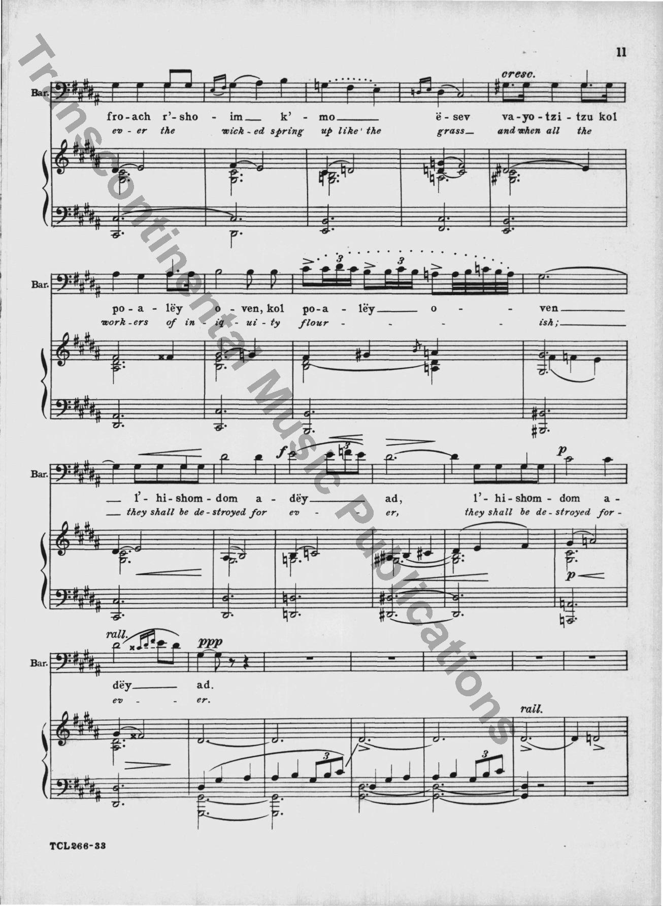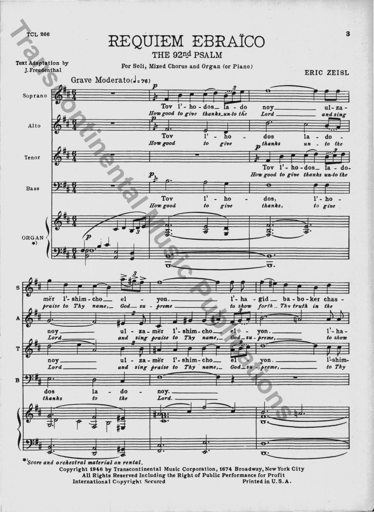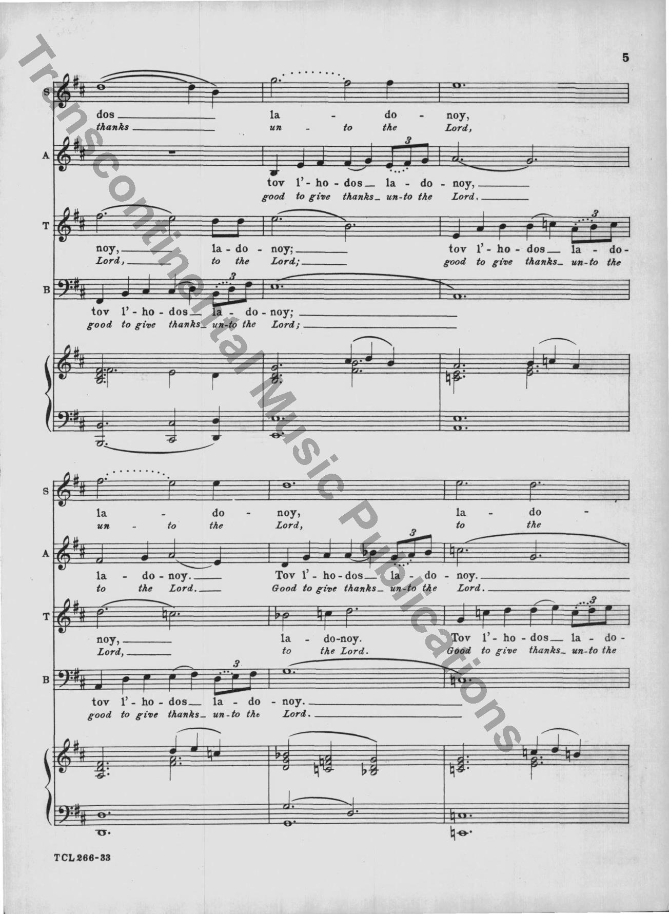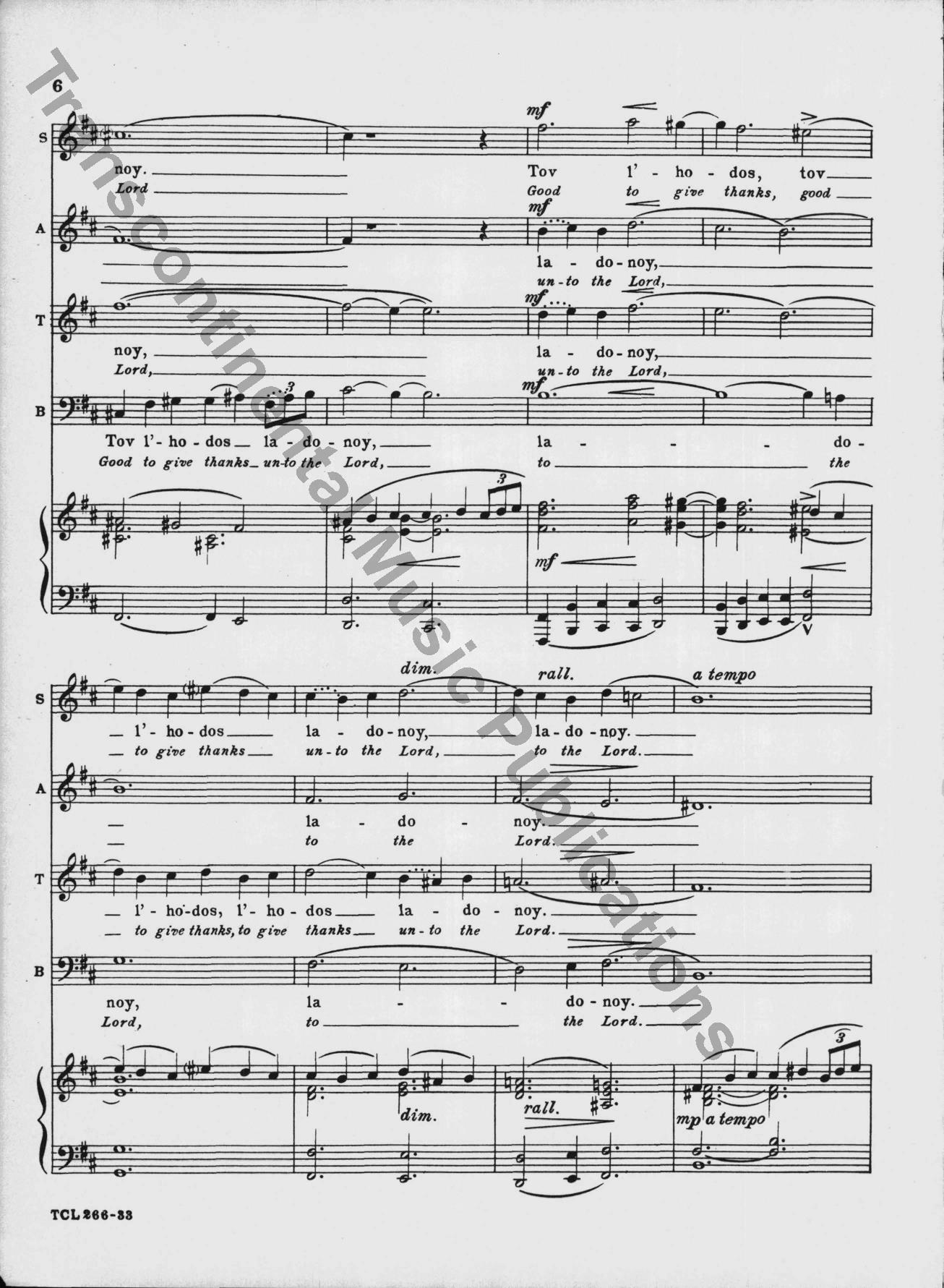 This classic 1949 choral masterpiece by Eric Zeisl sets Psalm 92 in singable English or Hebrew. Its grand-scale sound made a significant impact in the mid-century synagogue music world, and as was rare for its time, acknowledged the horrors of the Holocaust directly. From the original front matter: "True to ancient Judaic tradition, so significatly reflected in the Mourners' Kaddish—which in the hours of deepest sorrow "glorifies and sanctifies the Lo